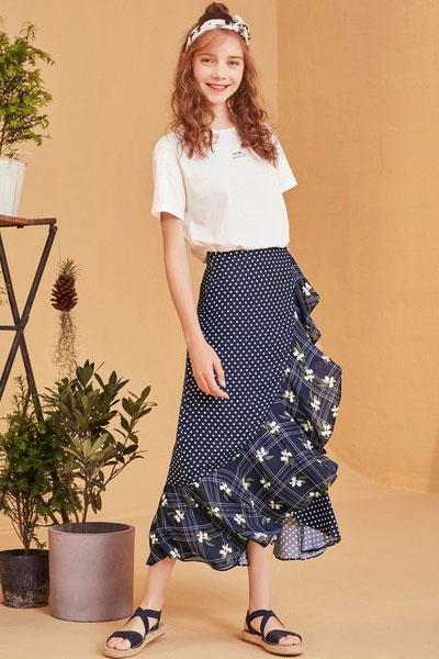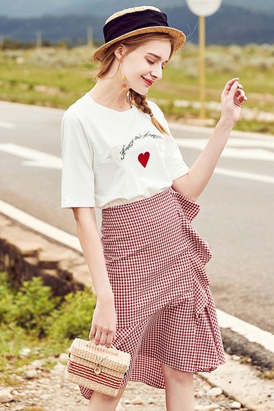 01 红白格子看着就活泼,加上不规则的荷叶边,有点小性感又有点可爱。高腰鱼尾的版型,显高显腿长。上身随便配件图案T恤,青春又有女人味。