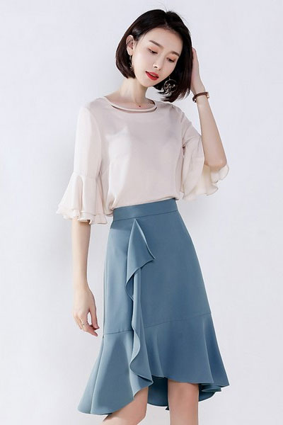 12 纯色裙子加上荷叶边,像雕塑一样有立体感。料子轻软,层次多但不笨重。前短后长,带点小开叉,显得腿又长又好看。设计感强,搭配就要做减法——素色或者莫兰迪色都行,和荷叶边上衣一起穿也能呼应上。