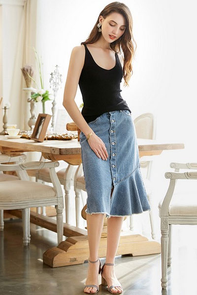 04 牛仔布硬朗,荷叶边柔美,拼在一起刚刚好。斜着拼接的荷叶边很抢眼,鱼尾裙摆走路时一摇一摆,还方便迈步。配什么上衣都行,俏皮或者街头风都能搭。