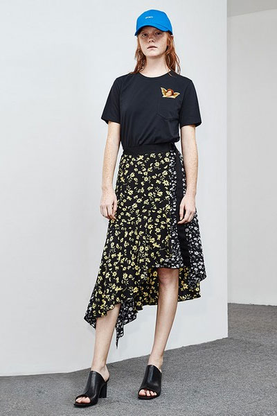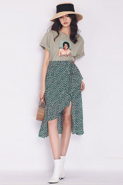 08 碎花加开叉,女人味和设计感都有了。围裹式的开叉不太规则,裙摆在膝盖上下晃,说不准到底多长,反而有意思。配T恤、运动鞋或者短靴,都挺轻松时髦。