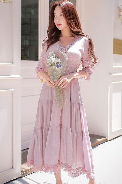 02 流苏的甜美感,二十岁穿是张扬的浪漫,三十岁穿就是悄悄减龄的小心机。这条裙子V领有点小性感,但更吸引人的是裙摆上拼接的那一圈流苏,好像只有这样,大裙摆才转得理所当然。
