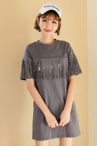 03 如果你觉得胸前不够丰满,流苏正好能帮上忙。从胸口到袖子上都是流苏,走起路来轻轻晃动,偶尔还露出一点拼色的内衬,若隐若现。本来T恤式直筒裙偏休闲,有了流苏就多了几分女人味。