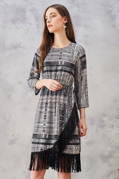 04 成熟知性的你,会懂这条裙子的好。颜色不算鲜亮,但配上这个年纪的气质,反而显得稳重大方。裙摆是不规则的,再加上流苏的点缀,一眼就能看到。颜色低调,但流苏让它有了抢镜的资本。