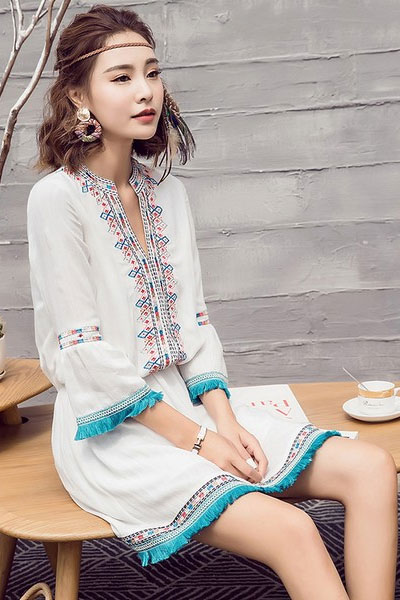 05 长流苏灵动,短流苏俏皮,各有各的好。这条裙子前襟和裙摆绣了民族风的图案,但整体还是纯白打底,很清爽。袖口和裙摆的流苏悄悄做了撞色,越看越喜欢。