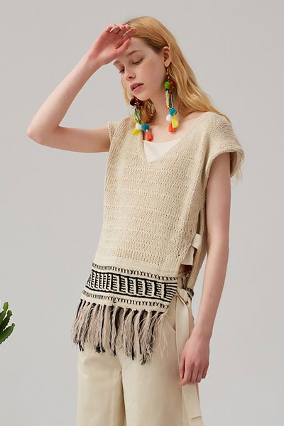 08 针织和流苏最合得来。夏天穿针织,花样简单,心态也平和,好像心静自然凉。这条裙子颜色大方得体,款式随意中带点慵懒,很对文艺范姑娘的胃口。