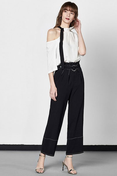 同样是黑色阔腿裤,这条在腰和裤腿上加了撞色的车线,细节很出彩。圆环腰带亮眼又高级。高腰加阔腿,包容性好,显瘦效果也棒,上班穿很利落。
