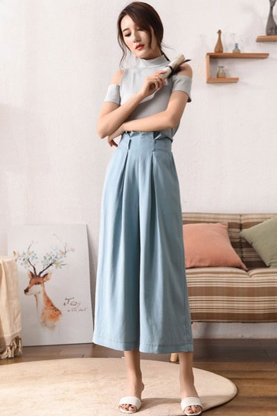 天丝面料滑滑凉凉的,夏天穿特别舒服。浅蓝色清爽又温柔。腰部的褶裥很有淑女味。阔腿裤本身就时髦,上身可以穿稍微露肤一点的款式,不会俗气。配白色上衣,夏天看着就清凉。