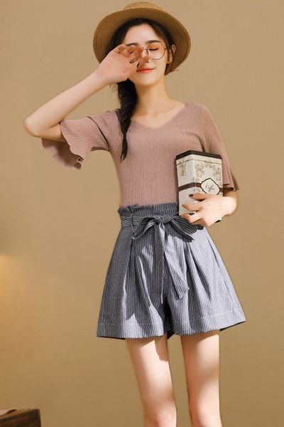 纸袋短裤真的能穿出小蛮腰大长腿,裤管宽松,夏天穿很凉快。细条纹低调又知性。上身配修身的纯色上衣,或者图案T恤,风格随你换。