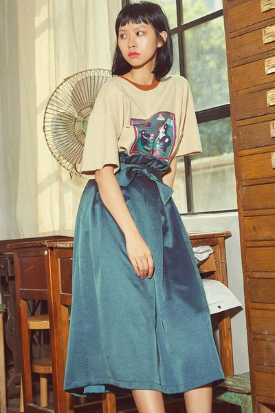 迷笛裙的长度很显瘦。腰部的褶皱做得特别漂亮,像一朵花。缎面有光泽,很显质感。侧面有隐形口袋,方便实用。配一件图案T恤,复古又有味道。