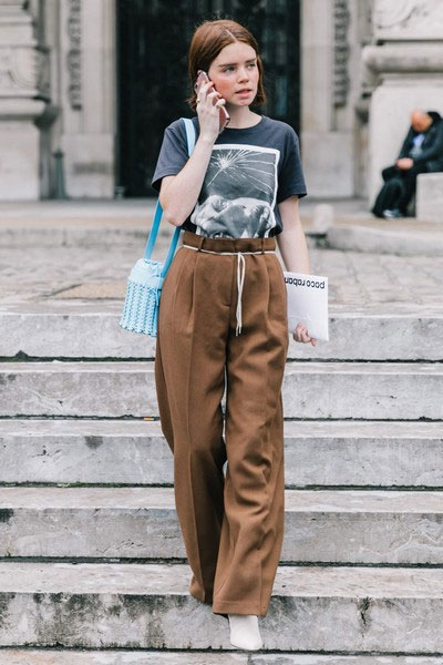 焦糖色拖地阔腿裤,腰部做了花苞设计,把T恤扎进去,腰线立马就高了。裤腿够长,里面穿双厚底鞋或者高跟鞋,小个子也能撑起大气场。复古图案T恤增加趣味,整体休闲又有范。)