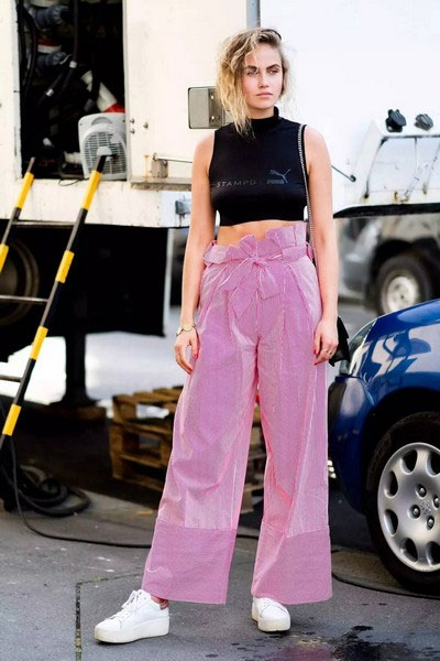纸袋裤腰部比较有层次,上身最好穿修身一点的背心,一松一紧才平衡。颜色上,素色背心配花色裤子,或者反过来,都不会出错。裤长合适的话,配平底鞋也好看。