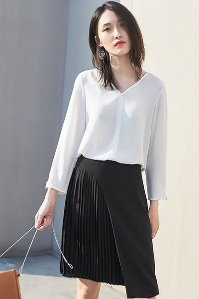 01 侧面开叉围裹,里面拼接了百褶。两种风格搭在一起,层次感很足。竖线条和弧形线条一起帮忙修饰身材。上身配简洁的衣服,重点突出这条裙子的剪裁,优雅又时髦。