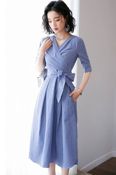 12 上半身是交叉西装领,不对称效果很好看。下半身是打褶A字裙摆,减龄显瘦。腰部绑带收一下,高挑又窈窕。白底蓝色细条纹,间杂一点点红色,看着很新鲜,有个性。