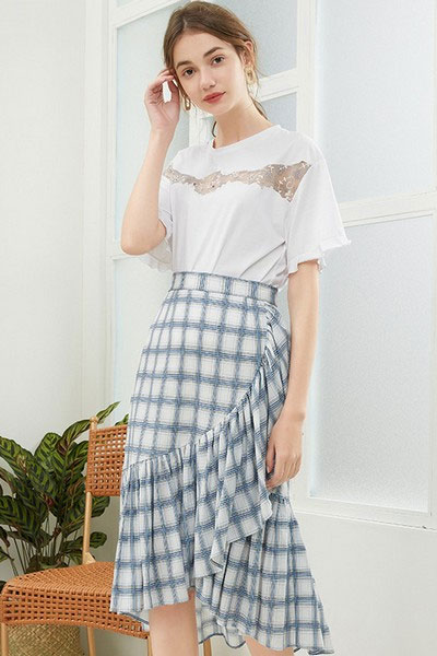 02 不规则荷叶边格子半裙,复古又文艺。围裹式开叉让腿若隐若现,能拉长腿部线条。配一件素雅白T恤,把下摆扎进裙腰里,上短下长,比例很好,整体清新又减龄。