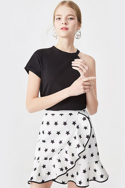 03 荷叶边鱼尾裙,能把腰臀线条衬得很好,显腿长。撞色包边和黑色星星图案呼应,俏皮又有活力。上身配简洁的小黑T恤,脚上一字带凉鞋或者帆布鞋,都很合适。