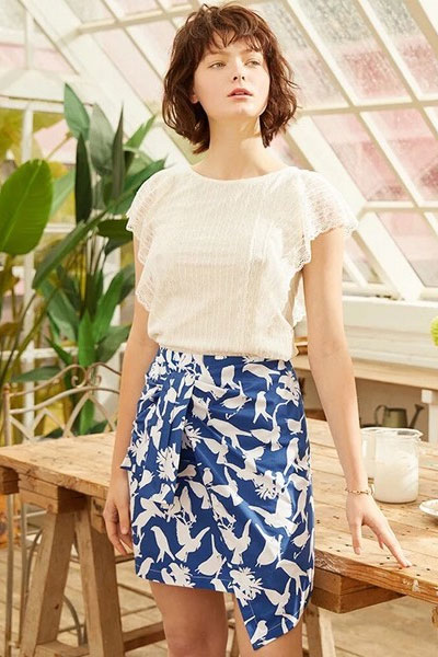 04 蓝底白色飞鸟印花,清爽又梦幻。短款显高,侧面打结围裹,曲线一下子就出来了。裙摆有层次感,也能拉长腿。配一件简单的小白衫,把腰线收好,时髦又清爽。