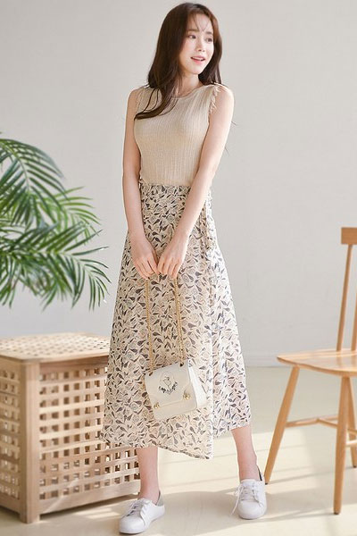 05 冰丝针织无袖衫,温柔又自然,流苏袖口随随便便就很好看。一片式印花围裹裙,露出细脚踝,显得腿直。米色一套很清新,视觉上就凉快,加一点白色单品更清爽。