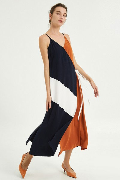 08 这条裙子不光剪裁特别,配色也出彩。黑白加焦糖色,不规则的几何拼接,颜色撞得有趣又时髦。侧边开叉系带,宽松慵懒。肩上吊带很细,配尖头鞋,性感得刚刚好。