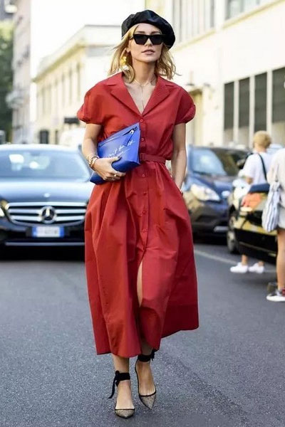 V形翻领的衬衫裙,一件搞定全身,上班逛街都能穿。V领瘦脸,高腰显高,下摆开叉显腿长。配双绑带尖头鞋,精致优雅。