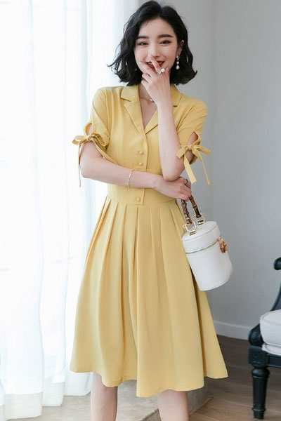 西装领衬衫裙,X型剪裁突出曲线。活力黄色显白减龄,高收腰加百褶A字裙摆,显瘦显腿长,复古可爱。长度在膝盖左右,正式休闲都能穿。