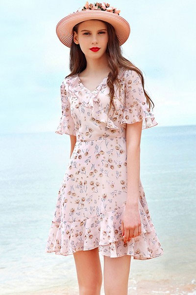 V领、喇叭袖、鱼尾裙摆都用荷叶边点缀,青春灵动。不对称斜裁提升时髦度。浅粉色碎花清爽衬肤,和夏天的阳光很配。