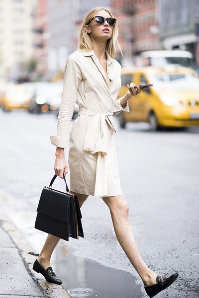 米色衬衫裙配乐福鞋,中性风和女人味平衡得刚刚好。黑色鞋包呼应,稳重干练,通勤穿很合适。