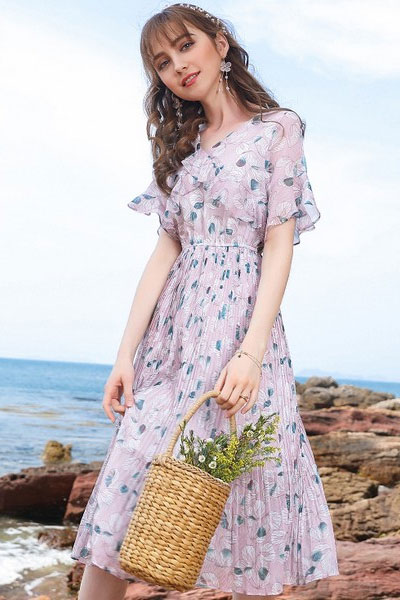 低饱和度的粉紫色,很好驾驭。小V领、荷叶袖,清凉显瘦。背后还有V领镂空,露背撩人。高腰百褶中长裙摆,清新复古。配草帽、草编包,开启度假模式。