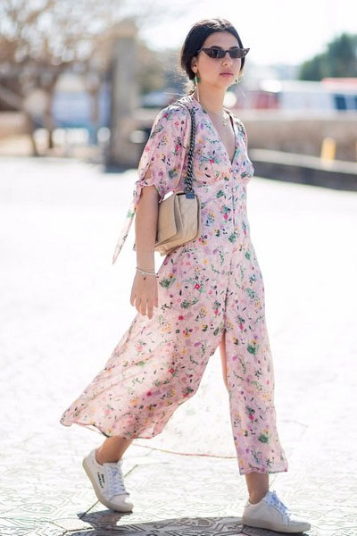 V领印花雪纺裙,清爽甜美,侧面开叉带点小性感。配双小白鞋,轻盈自在。