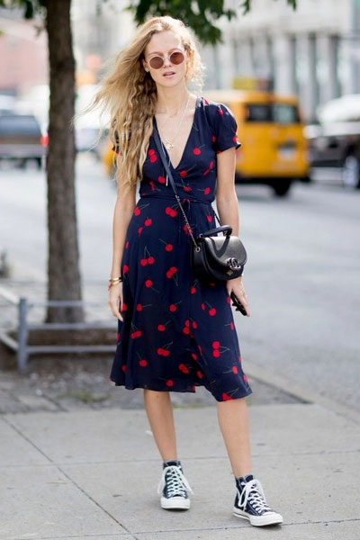 大V领清凉修身,还给项链、耳环留足了空间。深蓝底配红色樱桃,甜美可爱。配深色帆布鞋,青春气息很浓。