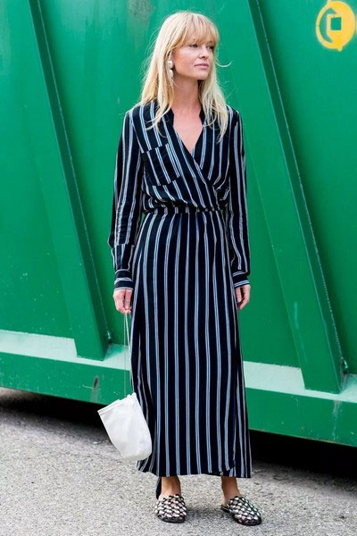 竖条纹拉长身材,围裹式慵懒优雅。配几何镂空穆勒鞋和白色手提包,繁简得当。大耳环和锁骨链二选一就行。
