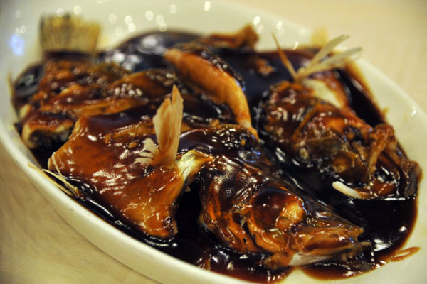 说到杭帮菜,就不能不提大名鼎鼎的西湖醋鱼。最传统的做法是将草鱼饿养一两天以去除泥土味儿,烹饪时需严格控制火候,仅耗三四分钟便将鱼烧制得恰到好处,最后浇上一层平滑油亮的糖醋即可。吃起来肉质鲜嫩、酸甜可口。然而,不是所有人都能吃得惯这个口味。此外,如果无法忍受草鱼的土腥味,也可以选择笋壳鱼、鳜鱼等鱼类。