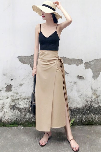 11 这条是不规则分片剪裁,腰间有绑带,裙摆有开叉,收腰、显瘦、拉长腿都照顾到了。沙色很百搭,配黑白单品就挺高级。加一点个性首饰,更好看。