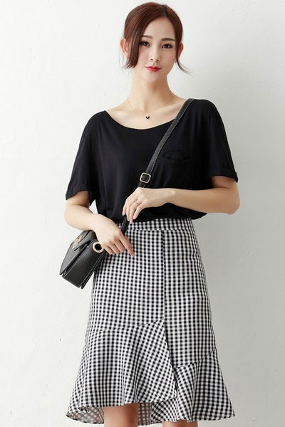 01 红白格子看着就活泼,加上不规则的荷叶边,有点小性感又有点可爱。高腰鱼尾的版型,显高显腿长。上身随便配件图案T恤,青春又有女人味。