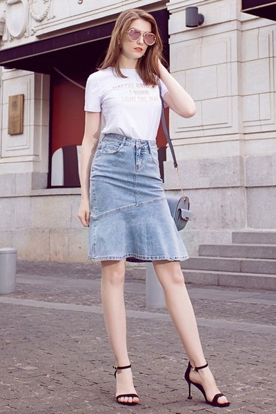 04 牛仔布硬朗,荷叶边柔美,拼在一起刚刚好。斜着拼接的荷叶边很抢眼,鱼尾裙摆走路时一摇一摆,还方便迈步。配什么上衣都行,俏皮或者街头风都能搭。