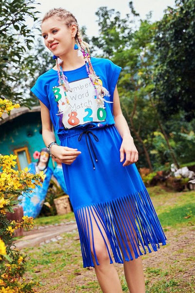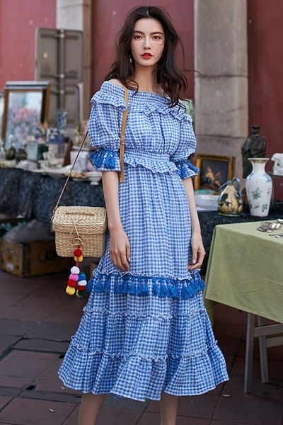 01 夏天大家都喜欢蓝白配色,清爽凉快。条纹有海军风的味道,格子也不差,随便穿穿就很好看。这条裙子的流苏用了更深一点的蓝色,在一身浅色里很突出,像是故意强调自己的存在感。