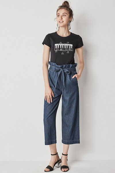 褶皱松紧腰加腰带,减龄又时尚。纯棉牛仔布软软的,夏天穿不闷热。阔腿版型,把上衣塞进腰里,精神又显高。九分长度露脚踝,配平底鞋或高跟鞋都好看。