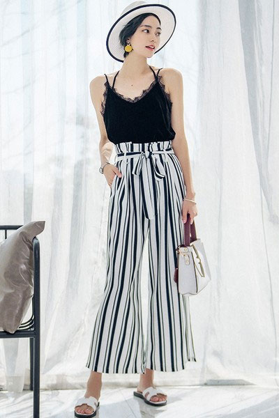 腰部是褶皱高腰,裤脚还有开叉,可爱里带点小性感。竖条纹显腿长。配吊带衫、草帽、凉拖,很有度假的感觉。