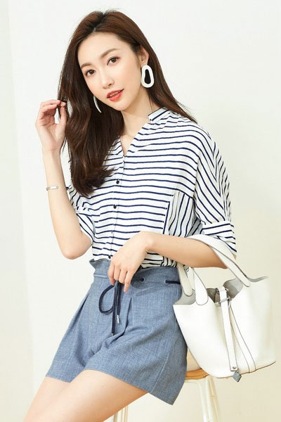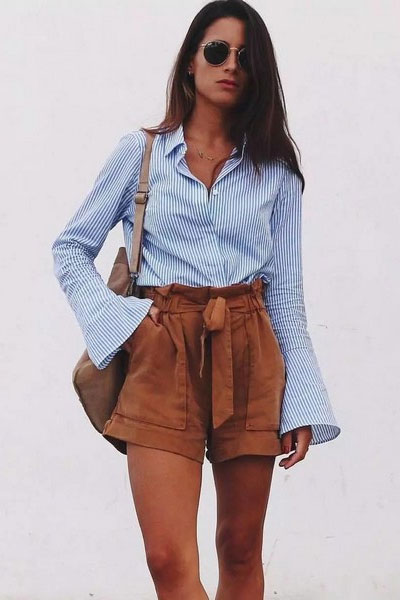 天气热了,短裤更凉快。大地色系的纸袋短裤配蓝色条纹衬衫,颜色反差大,很显肤色白。上班穿可以配尖头鞋,加件西装外套;平时休闲,配双帆布鞋或者凉拖就行。