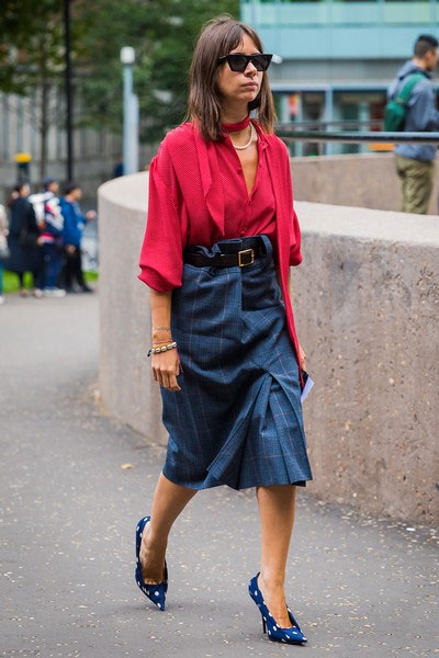 格纹半裙加上花苞腰,再用一条皮腰带强调一下,腰线更明显,人也显得挺拔。上身配红色波点衬衫,脚上穿蓝色波点高跟鞋,红蓝搭配很复古。再加一条珍珠项链,精致度就上来了。