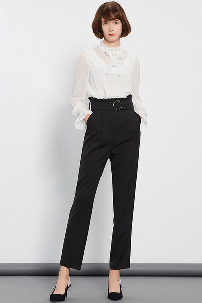 腰部是松紧带加褶皱,还有同色腰带可以打个蝴蝶结,很柔美。高腰加长裤腿,腰线定得高高的,配尖头鞋能拉长腿,还显瘦。