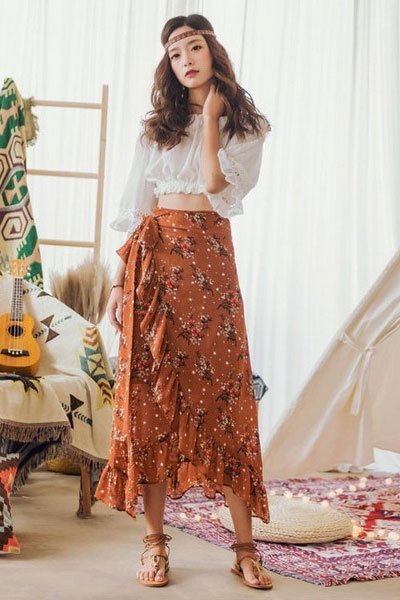 06 腰间绑带很舒服,斜裁荷叶边,前短后长,走路带风。里面有内衬,不怕走光。褐色调偏文艺复古,配白色衣服很耐看。选短款上衣比例更好,配绑带鞋很有度假感觉。