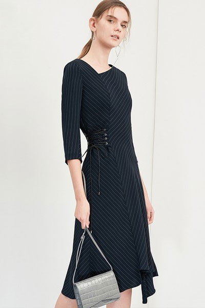 条纹在不同方向,利用视错觉显瘦。腰侧绑带突出曲线,不规则裙摆在膝盖附近,模糊边界显腿长。V领偏向右侧,性感又高雅。
