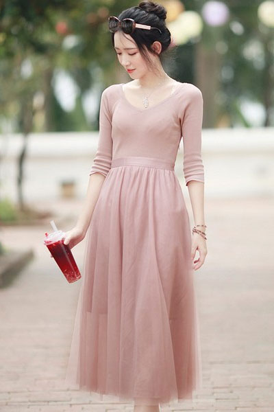 上下两种材质拼接:上半身薄针织,修身复古;下半身薄纱,飘逸仙气。腰间缎带后面系蝴蝶结,甜美减龄。雾粉色温柔梦幻,黄金比例和S曲线都有了。