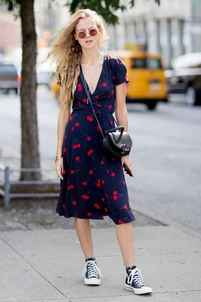 大V领清凉修身,还给项链、耳环留足了空间。深蓝底配红色樱桃,甜美可爱。配深色帆布鞋,青春气息很浓。