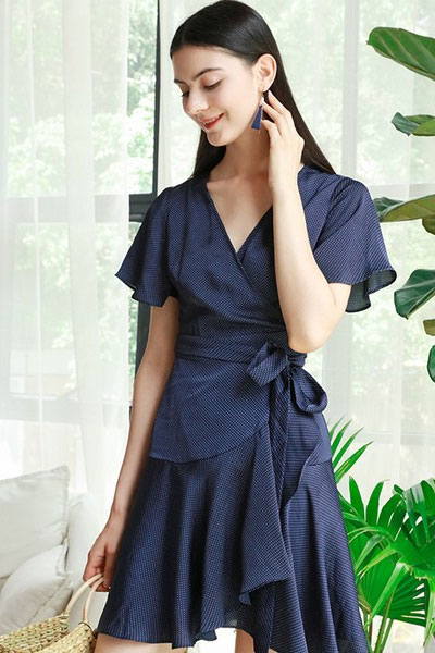 荷叶边、交叉围裹、波点,几个热门元素凑一起,优雅又时髦。袖口和裙摆的荷叶边,显得手臂和腿更细。收腰围裹显身材,藏蓝底白色小点,复古低调。长度在膝盖上,不挑身高,俏皮可爱。