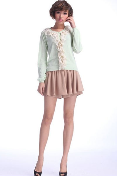 薄荷绿像马卡龙一样清甜,上面镶了一圈圈蕾丝边。一般开衫扣着穿容易显老,但这件扣上反而好看。配裸色半身裙和高跟鞋,青春又显高。