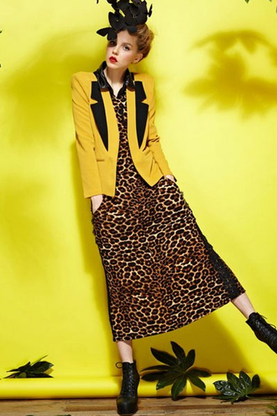 这件领口很特别——只在一边拼接了撞色,像一只蝴蝶。黑黄撞色强烈又俏皮,把西装的干练和可爱结合得很好。