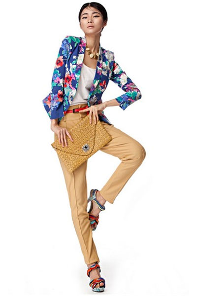 今年春夏没点印花都不好意思出门。不敢穿全身印花,就选一件印花小西装,保险又时髦。配卡其色休闲裤,加一条红色细腰带(记住:微胖姐妹一定要用细腰带,粗的显腰粗)。青果领的印花款,值得放进衣柜。