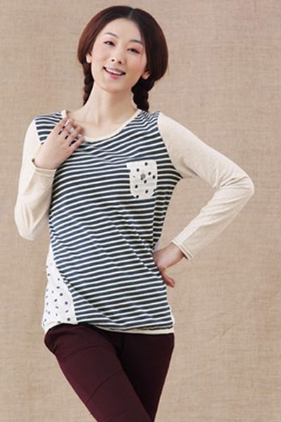 细条纹不容易变形,配上波点,俏皮又可爱。这件衣服的条纹没有顺着身体走,而是用拼接的方式把身形“切开”,留白处让波点登场。加上合身的剪裁,该遮的遮,该收的收,显瘦效果很实在。