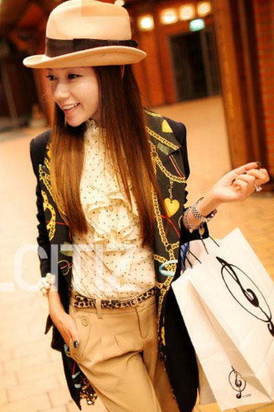 硬挺的修身西装,能把上半身的松垮轮廓“立”起来。这件中长款,衣摆过了臀部,正好把宽大的胯部遮住。翻驳领上还有复古印花,暗黑色系也不沉闷。搭配高跟鞋,整个人又高又瘦。